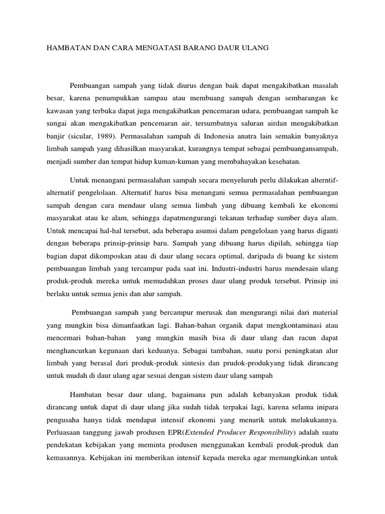 Keadaan ini disebabkan oleh pelbagai kelemahan dan kekangan dalam melaksanakan langkah langkah tersebut. Kempen kesedaran melalui iklan tv mengenai kesan sikap individu yang membuang sampah tanpa memikirkan kesannya. Langkah pertama sistem pengelolaan sampah di rumah adalah memisahkan sampah berdasarkan jenisnya.
