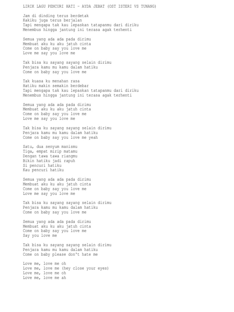 Lirik lagu pencuri hati. Jangan biarkan wangianmu mohon memahami ia melekat di hidung. Kepadamu pencuri hati yang tak ku sangka kan datang secepat ini padamu pencuri hati biarkan ini menjadi melodi cinta berdua. Lirik lagu pencuri hati ayda jebat jam di dinding terus berdetak kakiku juga terus berjalan tapi mengapa tak kau lepaskan tatapanmu dari diriku menembus hingga jantung ini terasa agak terhenti.